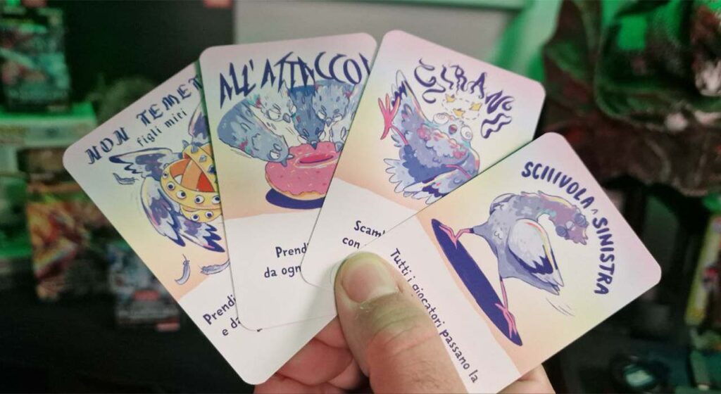 Les éléments du jeu sont tous de bonne qualitéimprimé sur du papier résistant (nous recommandons toujours de doublurer tous vos jeux de cartes, au cas où !) avec une attention particulière aux illustrations des cartes, qui nous ont beaucoup plu et qui ont une grande personnalité. On aurait cependant aimé que, compte tenu de la simplicité du jeu lui-même et de sa forte puissance imaginative, les pigeons en plastique se diversifiaient plus nettement. Au lieu de cela, ils sont tous pareils.